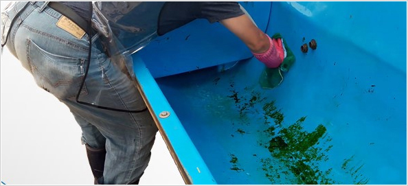 • 이끼가 잔뜩 끼어있는 스텐레스 물통내부, 스텐레스 수조에 적용이 가능하다.